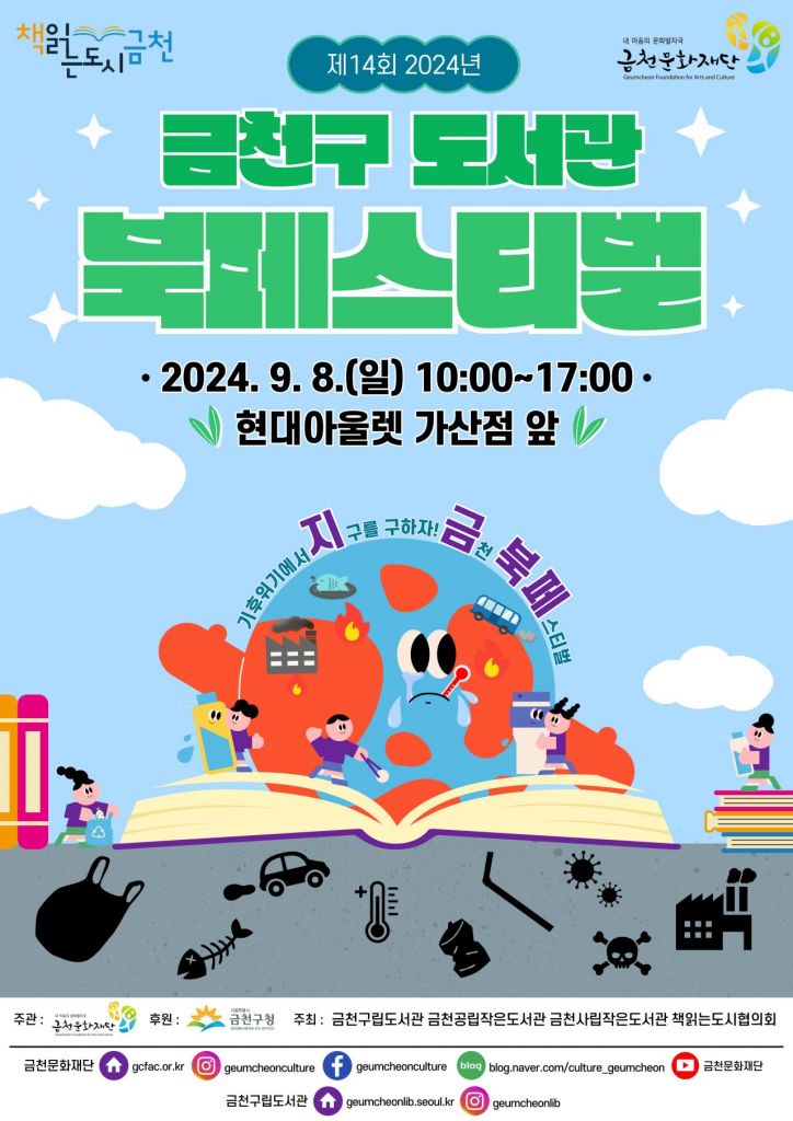 금천구(구청장 유성훈)와 금천문화재단(대표이사 서영철)은 9월 8일 오전 10시부터 현대아울렛 가산점 앞에서 책과 축제를 함께 즐기는 제14회 ‘금천구 도서관 북 페스티벌’을 개최한다고 밝혔다.