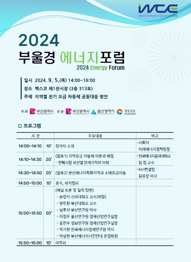 이번 포럼은 부울경 초광역경제동맹의 일환으로, '지역별 전기요금 차등제'에 대한 이해도를 높이고, 에너지분권 실현 등 지역경제 활성화를 위한 정책방향을 모색, 공론화하고자 마련됐다. 특히 '2024 기후산업국제박람회(WCE)'와 연계 개최해 상승(시너지)효과를 도모한다.