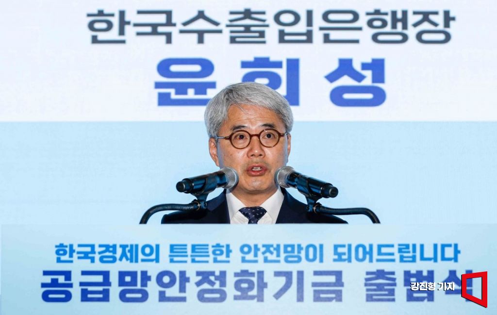 윤희성 수출입은행장이 5일 서울 여의도 수출입은행에서 열린 '공급망안정화기금 출범식'에 참석해 출범사 하고 있다.