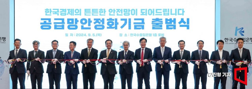 최상목(왼쪽 여섯 번째) 경제부총리 겸 기획재정부 장관과 윤희성(왼쪽 일곱 번째) 수출입은행장을 비롯한 주요 내빈들이 5일 서울 여의도 수출입은행에서 열린 '공급망안정화기금 출범식'에 참석해 출범을 기념하는 테이프 컷팅을 하고 있다.