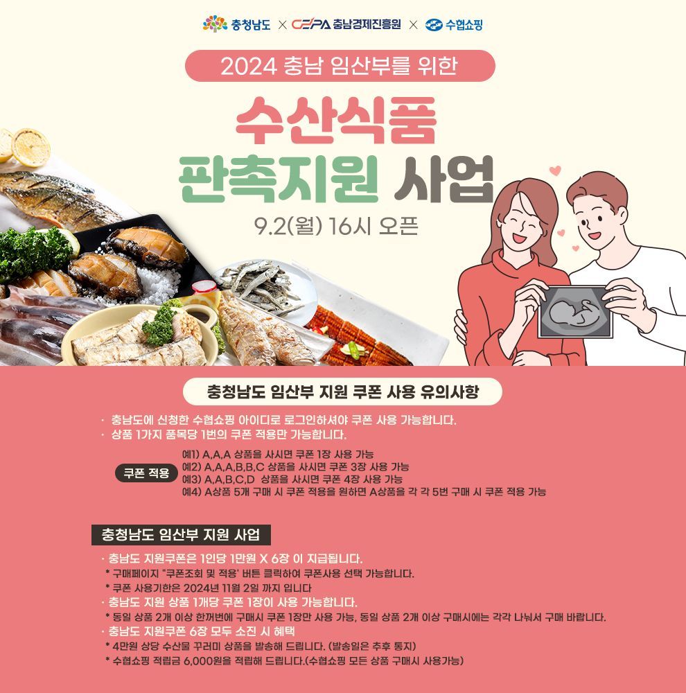 수협중앙회 직영 쇼핑몰 수협쇼핑이 충청남도 및 충남경제진흥원과 함께 '2024 충남 수산 식품 임산부 대상 수산물 판촉(꾸러미) 지원사업'을 실시한다고 5일 밝혔다.