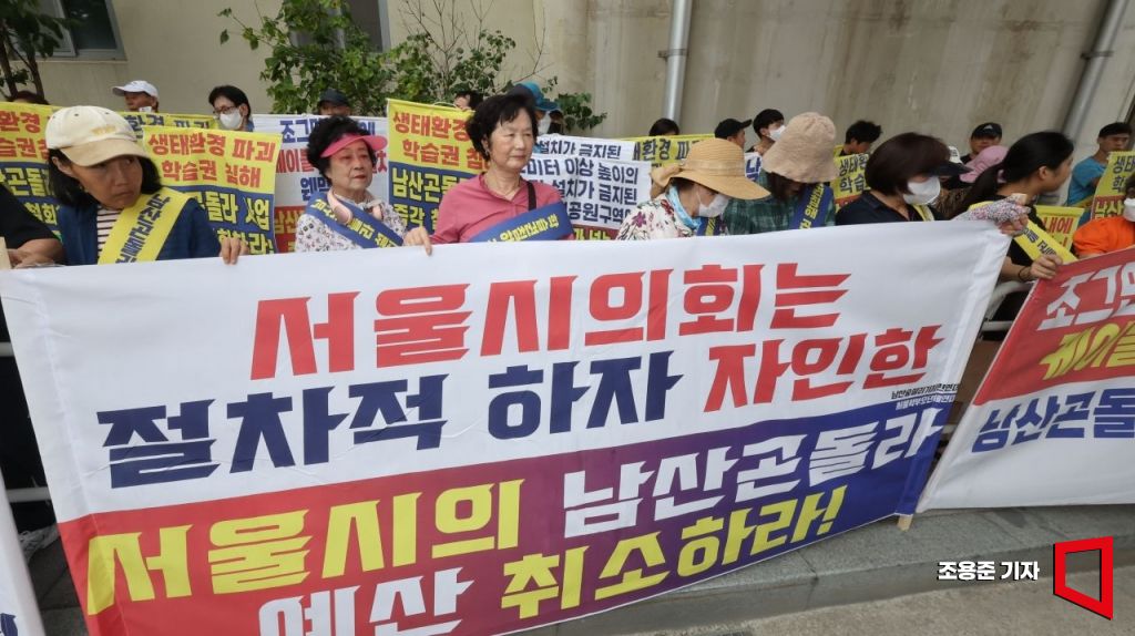남산 곤돌라 착공식이 열린 5일 서울 중구 예장공원앞에는 곤돌라 설치를 반대하는 시민단체들이 나와 집회를 하고 있다. 남산 곤돌라는 명동역에서 200m 떨어진 예장공원(하부승강장)에서 남산 정상부(상부승강장)까지 804m를 운행한다. 사진=조용준 기자 jun21@