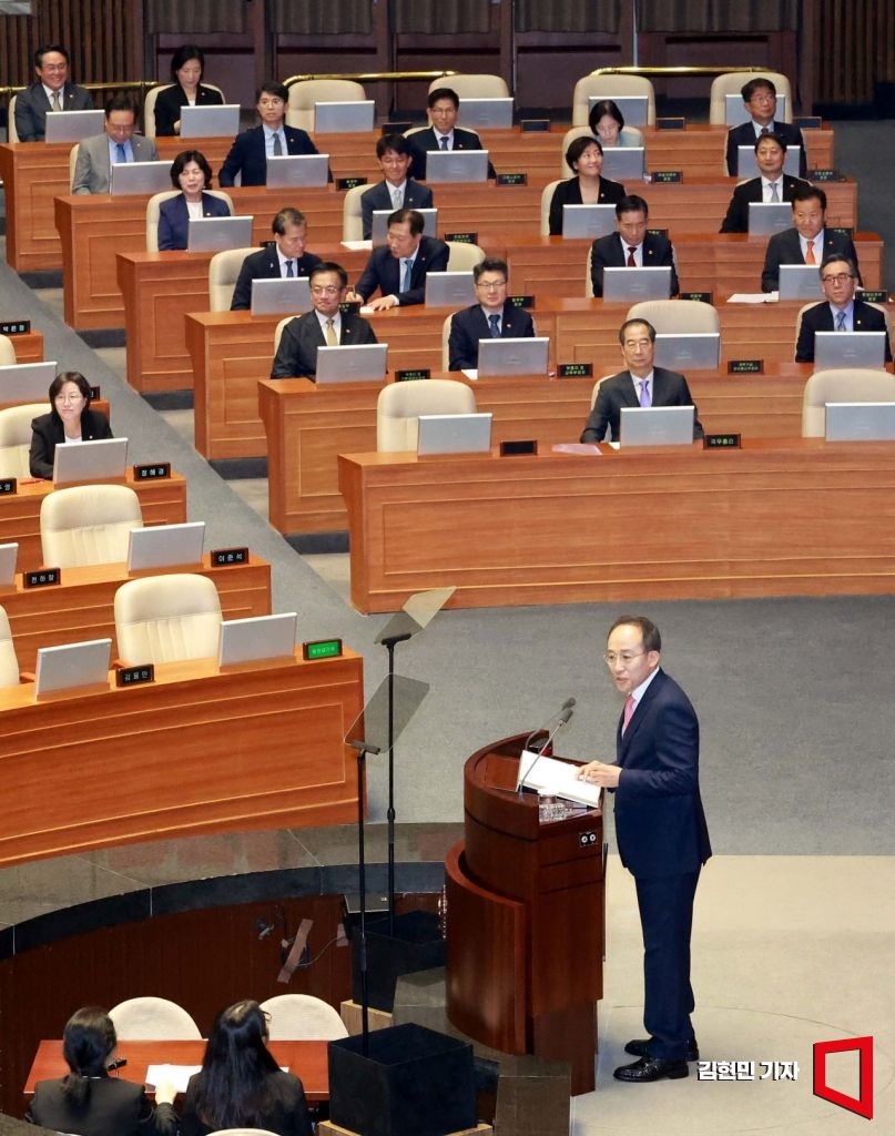 추경호 국민의힘 원내대표가 5일 국회에서 열린 본회의에서 교섭단체 대표연설을 하고 있다. 사진=김현민 기자 kimhyun81@