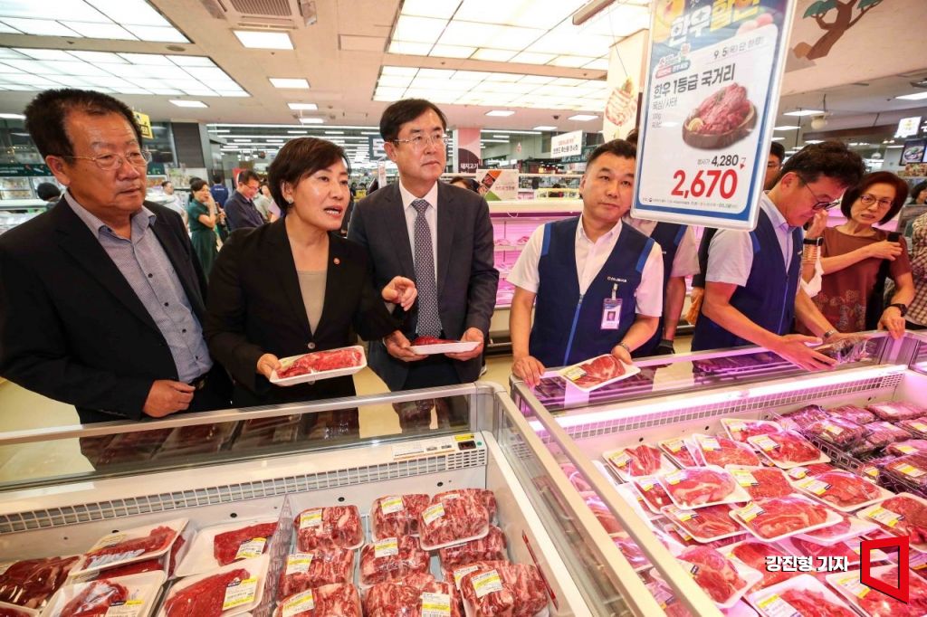 송미령 농림축산식품부 장관이 5일 서울 서초구 하나로마트 양재점을 방문해 추석 명절을 앞두고 한우 가격을 점검 하고 있다.