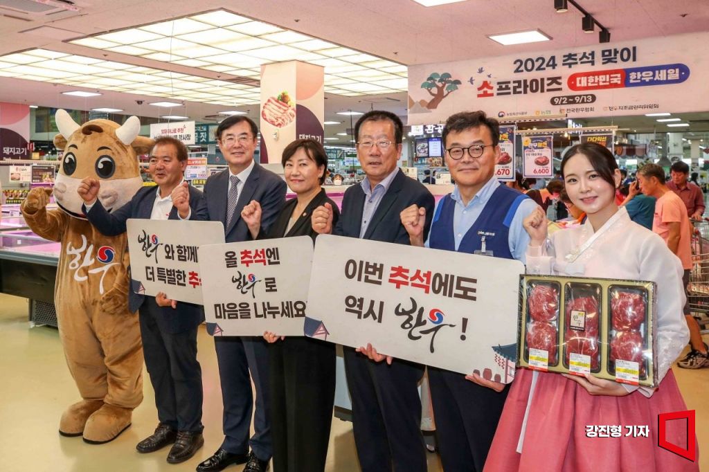 송미령 농림축산식품부 장관이 5일 서울 서초구 하나로마트 양재점에서 추석 명절을 앞두고 한우소비를 촉진하는 캠페인을 펼치고 있다.