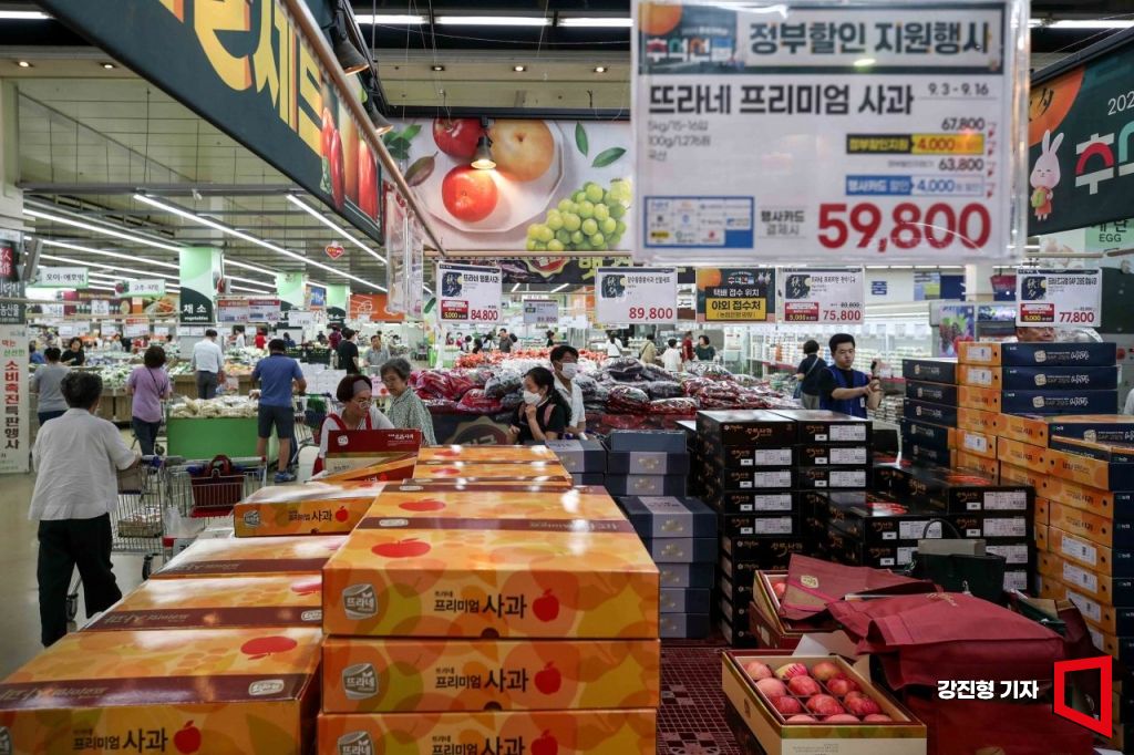 민족 대명절 추석을 앞두고 있는 5일 서울 서초구 하나로마트 양재점에서 사과 선물세트를 판매하고 있다.