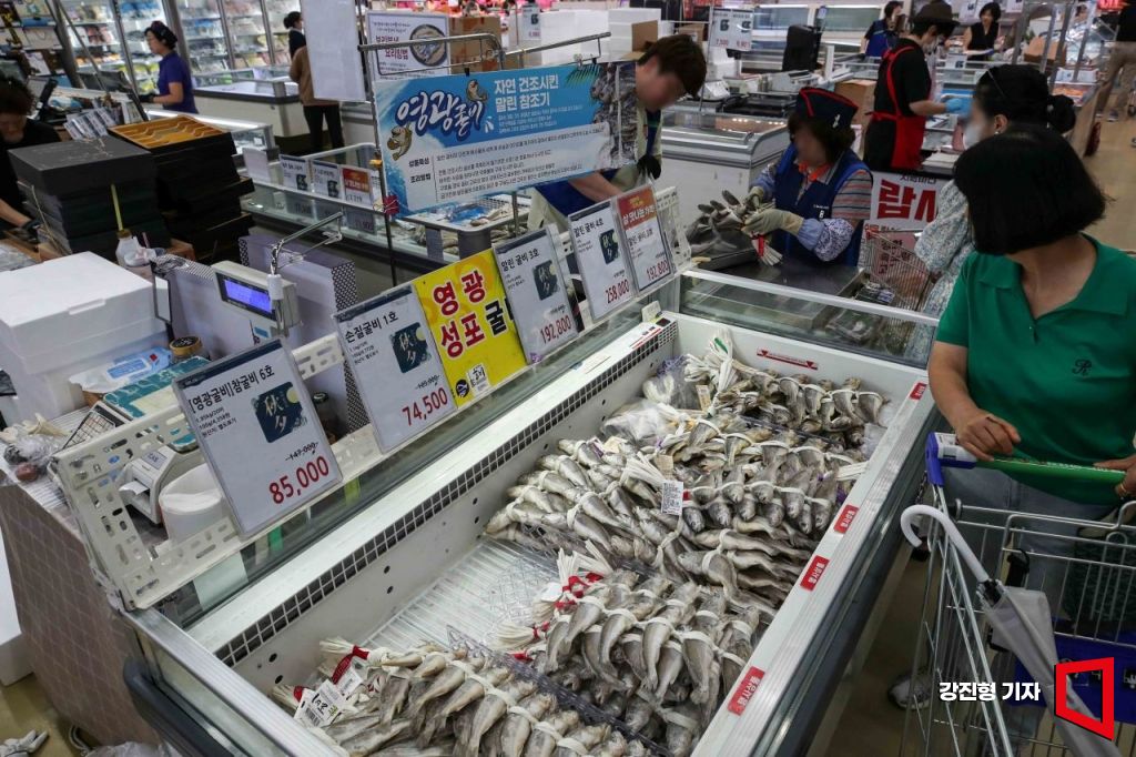 5일 서울 서초구 하나로마트 양재점에서 굴비를 판매하고 있다. 민족 대명절 추석을 앞두고 굴비와 김 등 주요 수산물 가격이 상승하고 있다. 한국농수산식품유통공사에 따르면 굴비가 1마리에 2763원으로, 1년 전보다 37.1% 상승했고, 연초 장당 100원을 밑돌던 김 소매가격은 전날 기준 장당 135원으로 올라 1년 전에 비해 38% 상승 했다.