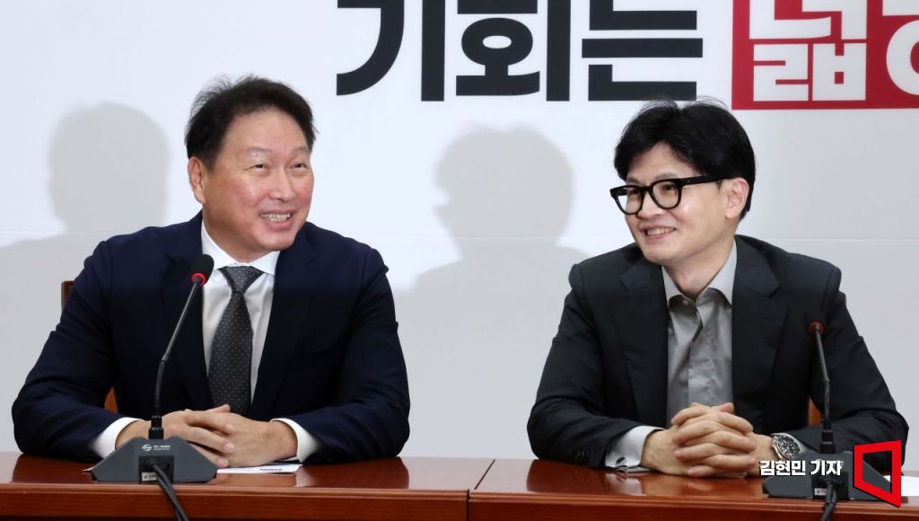 한동훈 국민의힘 대표가 5일 국회를 찾은 최태원 대한상공회의소 회장과 만나 대화하고 있다. 사진=김현민 기자 kimhyun81@