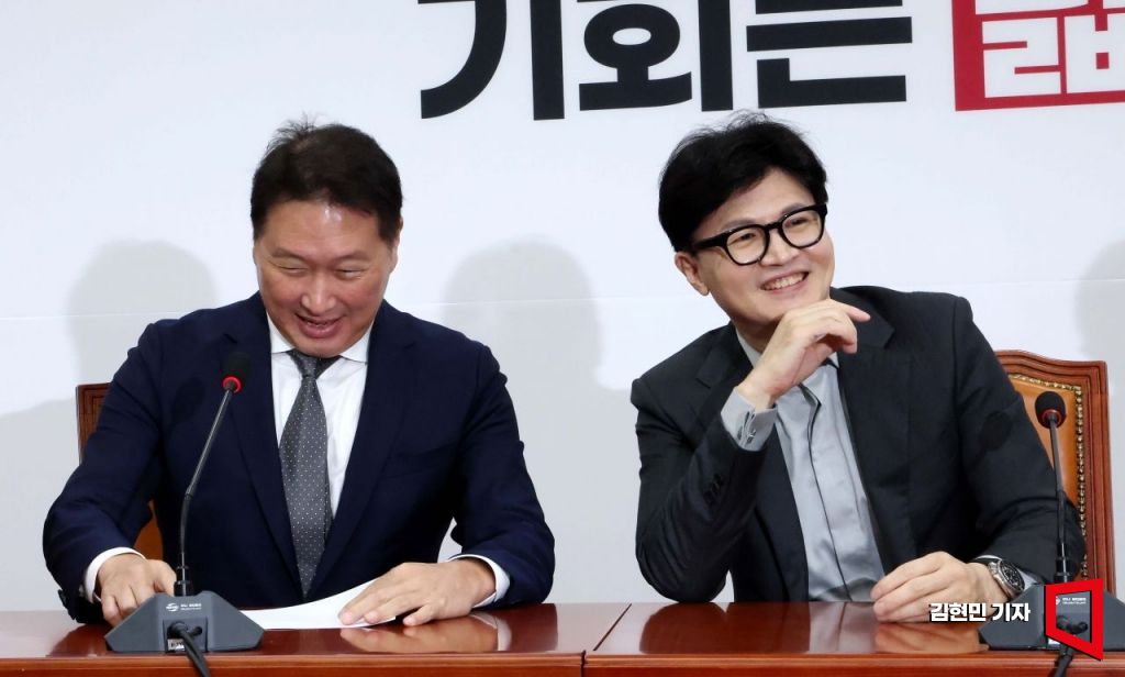 한동훈 국민의힘 대표가 5일 국회를 찾은 최태원 대한상공회의소 회장과 만나 대화하고 있다. 사진=김현민 기자 kimhyun81@
