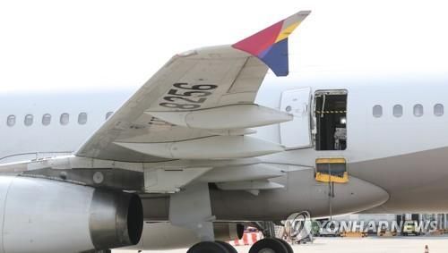 A씨의 난동으로 비상문 등이 훼손된 아시아나항공 항공기의 모습[사진출처=연합뉴스]