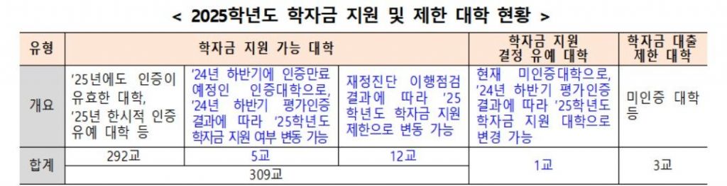교육부는 학자금지원제도심의위원회 심의를 거쳐 2025학년도에 적용되는 학자금 지원 및 제한 대학 총 313교 명단을 6일 발표했다. 지난해까지 교육부는 정부 주도의 재정지원제한대학 평가를 통해 학자금 제한 등을 결정했지만, 2025학년도부터는 한국대학평가원·고등직업교육평가인증원이 수행하는 '기관평가인증' 결과와 사학진흥재단의 '재정진단' 결과를 활용하도록 바뀌었다.