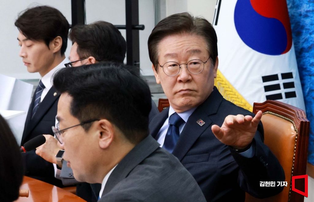 이재명 더불어민주당 대표가 6일 국회에서 열린 최고위원회의 도중 관계자를 향해 손짓하고 있다. 사진=김현민 기자 kimhyun81@
