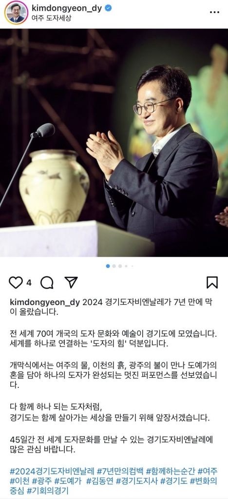 이어 "개막식에서는 여주의 물, 이천의 흙, 광주의 불이 만나 도예가의 혼을 담아 하나의 도자가 완성되는 멋진 퍼포먼스를 선보였다"며 "다 함께 하나 되는 도자처럼, 경기도는 함께 살아가는 세상을 만들기 위해 앞장서겠다"고 약속했다.