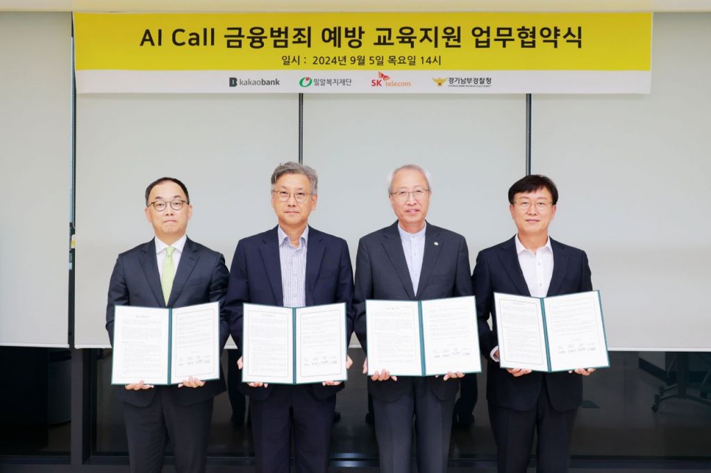 ▲지난 5일 서울 강남구 밀알복지재단에서 윤정백 카카오뱅크 금융소비자보호총괄책임자(왼쪽 두번째)와 엄종환 SK텔레콤 ESG혁신담당 부사장(왼쪽 첫번째), 정형석 밀알복지재단 상임대표(왼쪽 세번째), 이동권 경기남부경찰청 수사과장(왼쪽 네번째)이 'AI Call 금융범죄 예방 교육' 업무협약식을 맺고 기념촬영을 하고 있다.