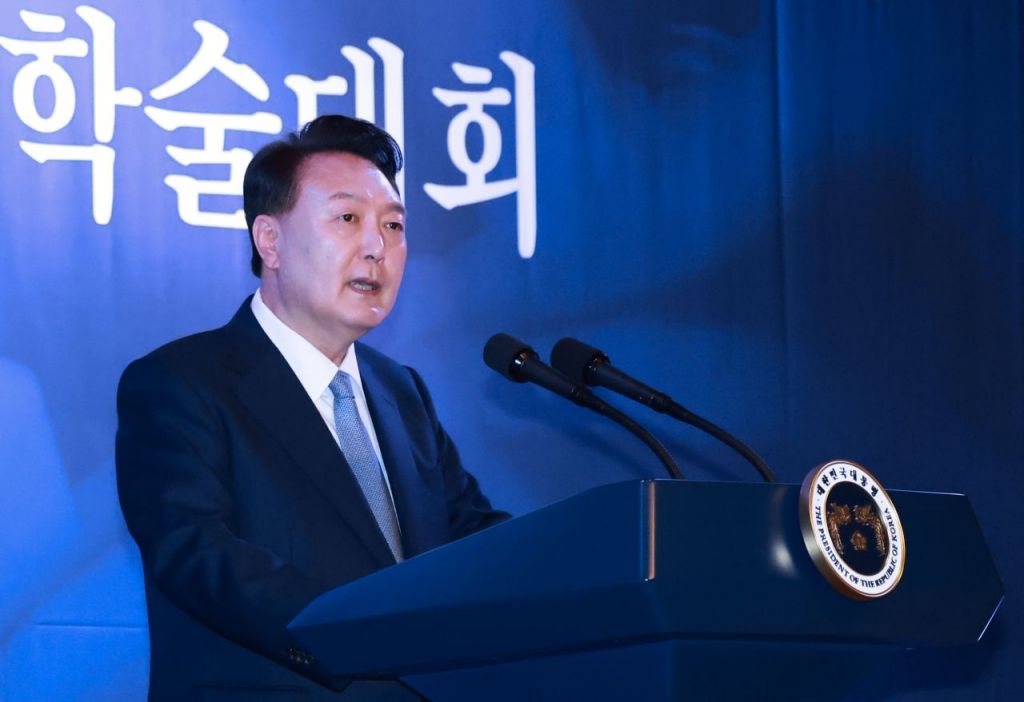 윤석열 대통령이 6일 서울 중구 더 플라자호텔에서 열린 한국법학교수회 창립 60주년 기념식 및 학술대회에서 축사를 하고 있다. [이미지출처=연합뉴스]