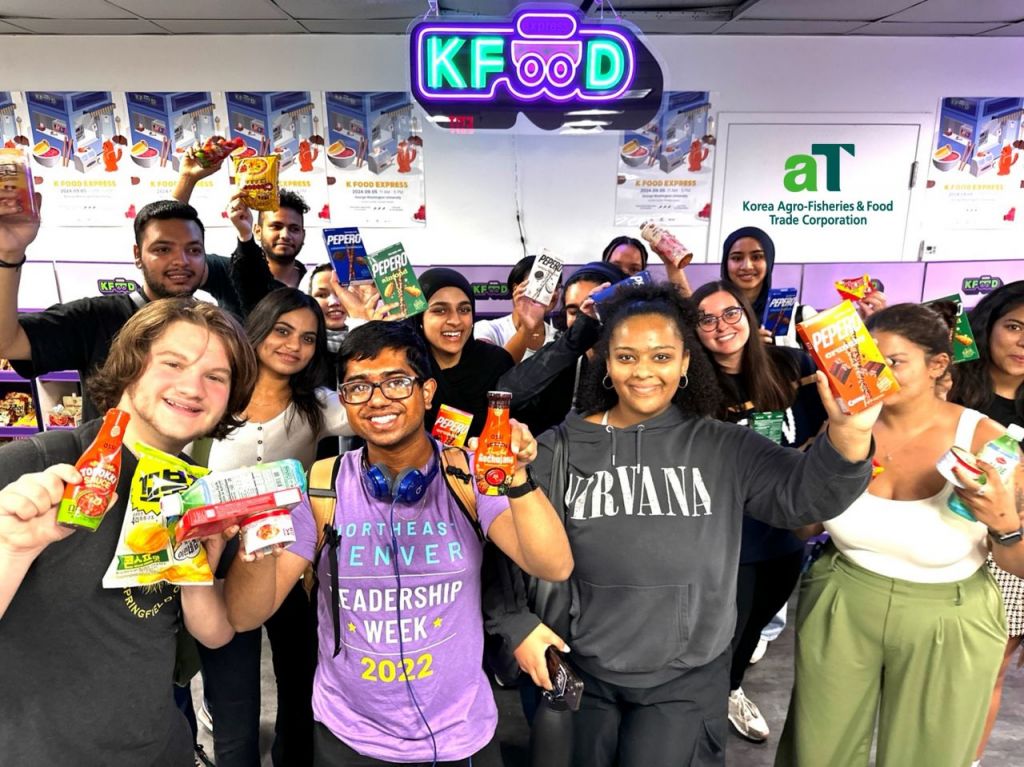 미국 조지워싱턴대에서 열린 K-푸드 홍보 행사에서 참가 학생들이 기념사진을 찍고 있다. / [사진제공=한국농수산식품유통공사]