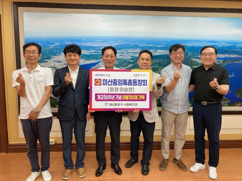 경남 창원특례시 마산합포구는 6일 마산중앙고등학교 총동창회에서 개교 50주년을 맞아 이웃돕기 이불 100채를 기탁했다고 밝혔다.
