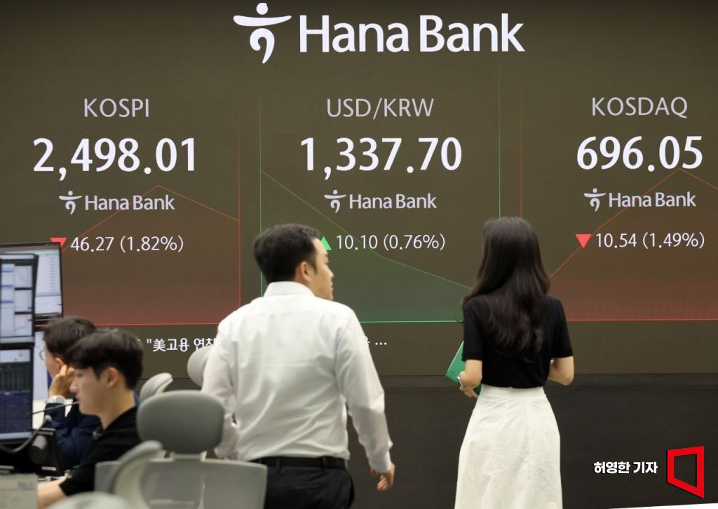 지난 주 경기침체 우려로 미국 증시가 급락한 가운데 9일 코스피는 전장 대비 47.92포인트(1.88%) 내린 2496.36로 출발했고, 코스닥 지수도 1.56% 내린 695.53로 출발했다 . 서울 을지로 하나은행 본점 딜링룸 전광판에 각종 지수들이 표시되고 있는 가운데 직원들이 업무를 보고 있다. 사진=허영한 기자 younghan@