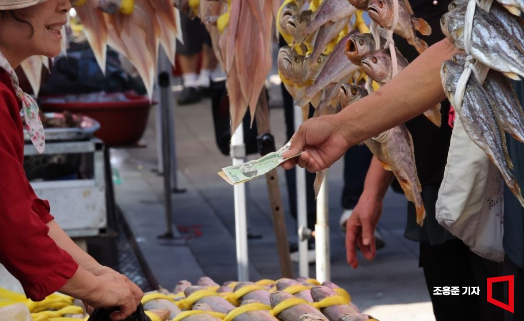 민족최대명절인 추석을 일주일여 앞둔 9일 오일장이 열린 성남 모란민속시장을 찾은 시민이 굴비값을 지불하고 있다. 사진=조용준 기자 jun21@