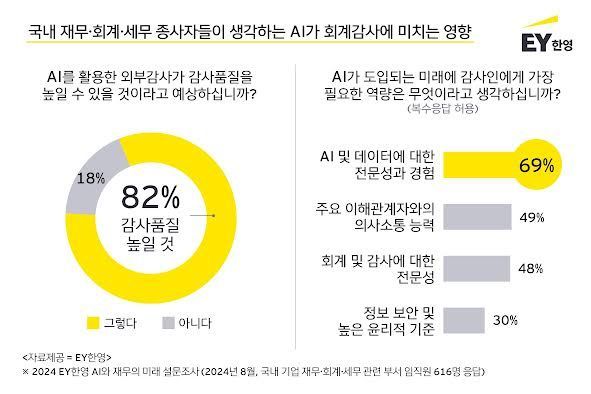 글로벌 회계·컨설팅 법인 EY한영의 설문조사 결과, 국내 기업 재무·회계·세무 종사자 대다수가 인공지능(AI) 도입으로 감사 품질이 향상될 것으로 기대했다. 향후 ‘AI 기술 및 데이터에 대한 전문성과 경험’이 감사인의 핵심 역량이 될 전망이다.