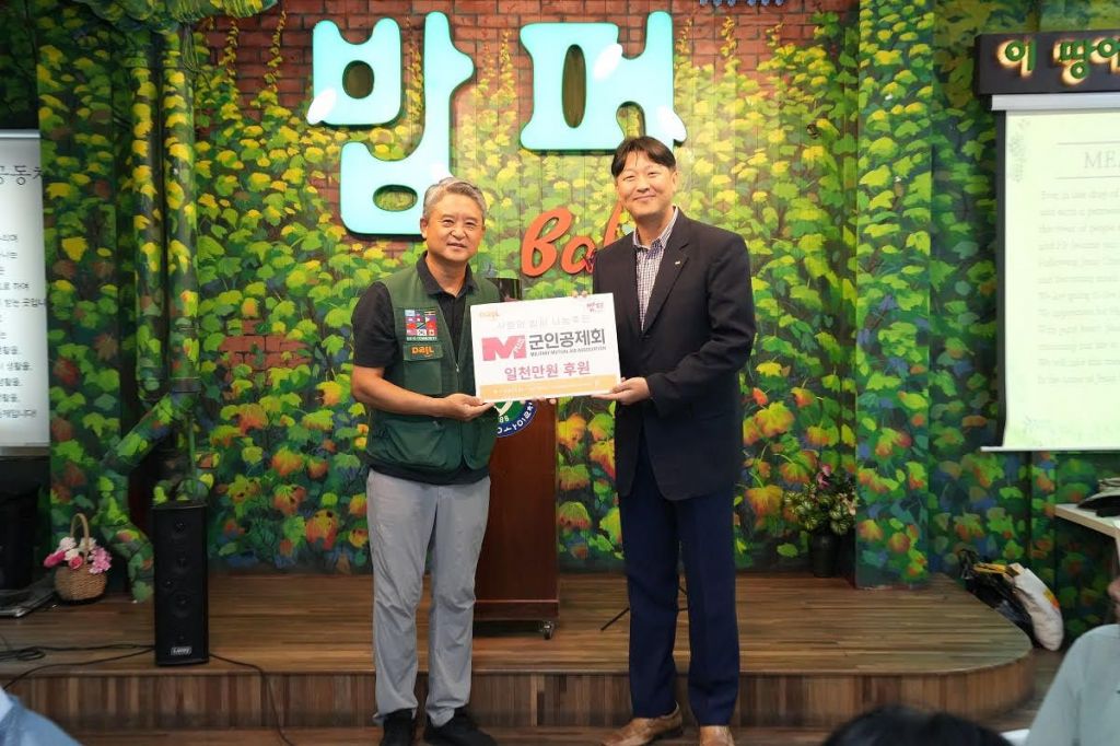 군인공제회 김기찬 경영지원본부장(오른쪽)이 밥퍼나눔 운동본부에서 기부금을 전달하고 있다.[사진제공=군인공제회]