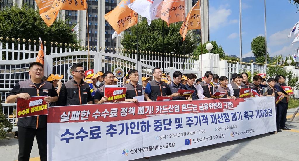 카드가맹점 수수료율이 올해 연말 인하될 것으로 예측되는 가운데 카드사 노동자들이 "가맹점수수료율 추가 인하를 즉각 중단하고 주기적 재산정을 폐기하라"고 요구했다. 적격비용 재산정 제도는 이른바 '마른걸레 쥐어짜기' 제도라며 카드사 경쟁력을 떨어뜨린다는 주장이다.