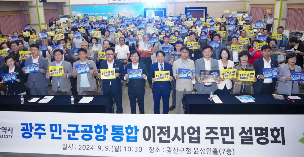 광주광역시(시장 강기정)는 9일 광산구청 윤상원 홀에서 강기정 시장을 비롯해 박병규 광산구청장, 박필순·최지현 시의원, 지역 구의원, 주민 등 300여명이 참석한 가운데 ‘민·군 통합공항 이전사업 주민설명회’를 개최했다.