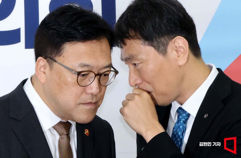김병환 금융위원장과 이복현 금감원장이 11일 국회에서 열린 금융 취약계층 보호 및 불법 사금융 근절 대책 당정협의회에 앞서 대화하고 있다. 사진=김현민 기자 kimhyun81@