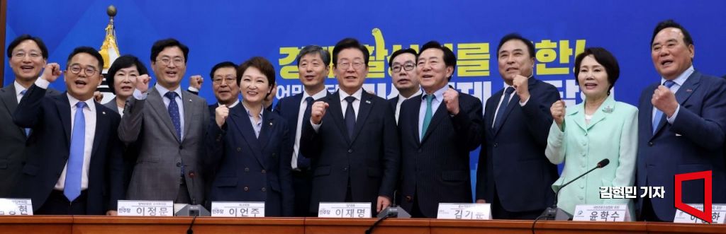 이재명 더불어민주당 대표와 김기문 중소기업중앙회장 등이 11일 국회에서 열린 더불어민주당-중소기업계 민생경제 간담회에서 파이팅을 외치고 있다. 사진=김현민 기자 kimhyun81@