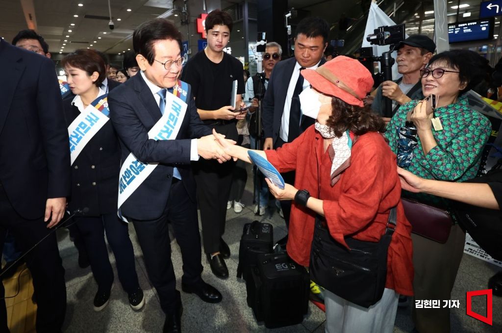 이재명 더불어민주당 대표가 13일 서울 용산역에서 시민들을 만나 추석 귀성인사를 하고 있다. 사진=김현민 기자 kimhyun81@