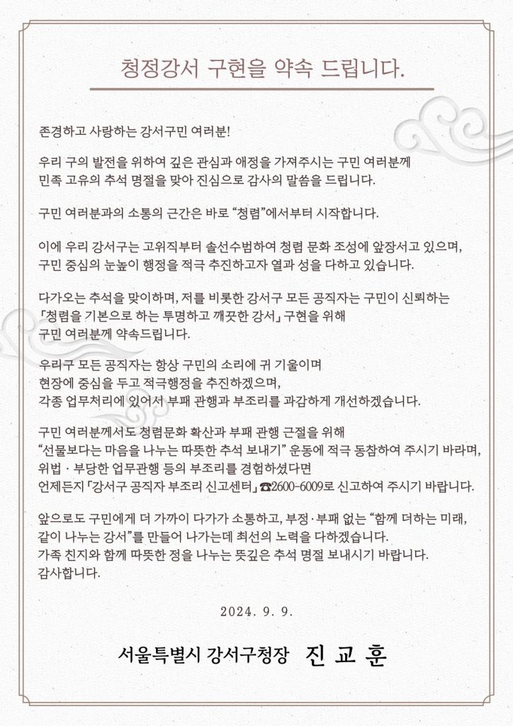 청렴 서한문은 직원과 구민을 대상으로 각각 게시됐다. 전 직원을 대상으로 한 서한문엔 명절, 인사철 관행적 선물 수수 근절 등의 청렴 준수사항이 담겨 있다. 구민들에게는 구의 청렴 의지를 표명하고 명절맞이 청렴 문화 확산에 동참해 줄 것을 당부하는 내용이 담겨 있다.
