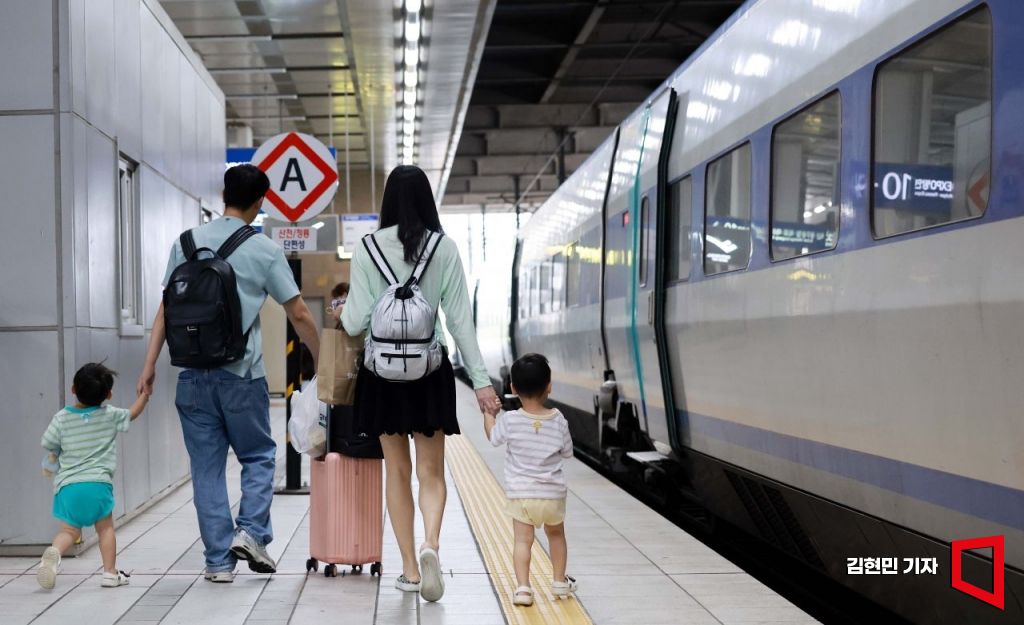 추석 연휴를 하루 앞둔 13일 서울 용산역 플랫폼에서 귀성에 나선 한 가족이 열차에 오르고 있다. 사진=김현민 기자 kimhyun81@