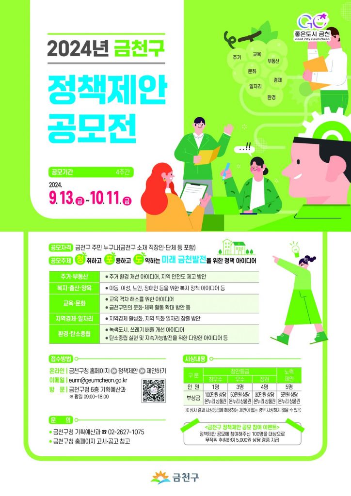 금천구(구청장 유성훈)가 지역 발전과 문제를 해결하기 위해 10월 11일까지 ‘2024년 금천구 정책제안 공모전’을 개최한다고 밝혔다.