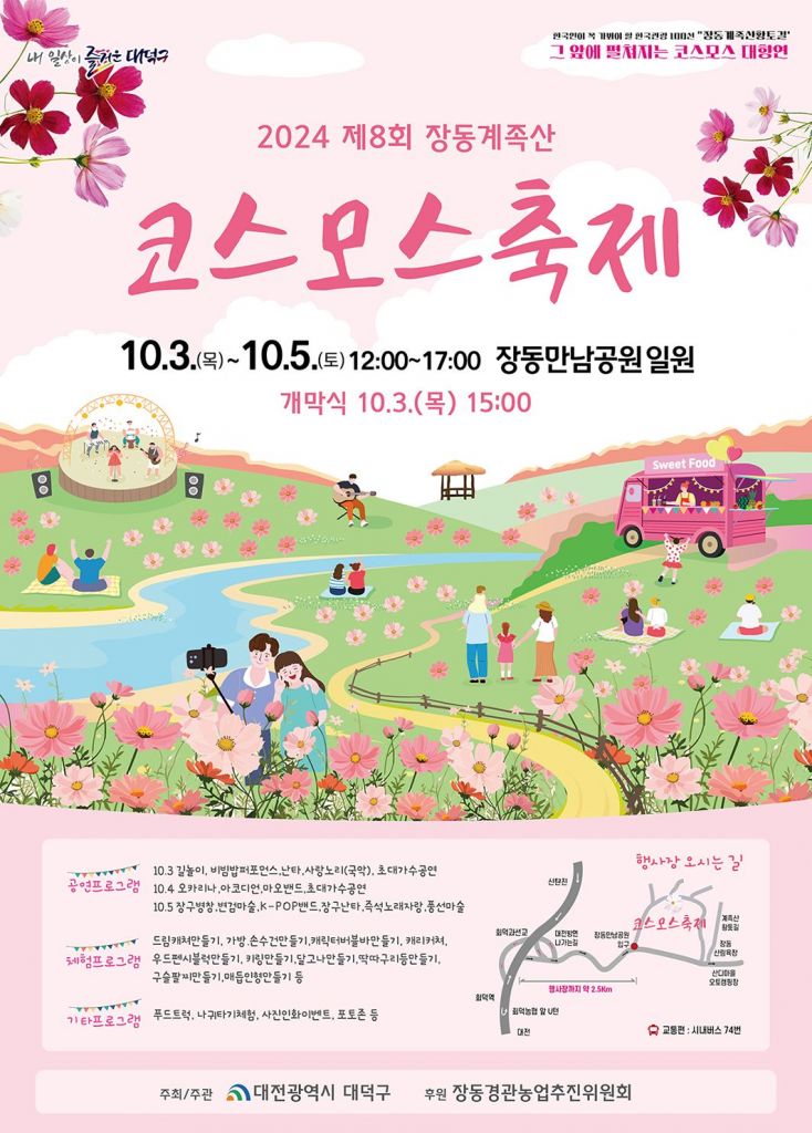 장동계족산 코스모스 축제는 4만㎡ 규모의 핑크빛 코스모스가 펼쳐져 있는 장동지역의 특색을 살린 대덕구의 대표적 지역축제다.