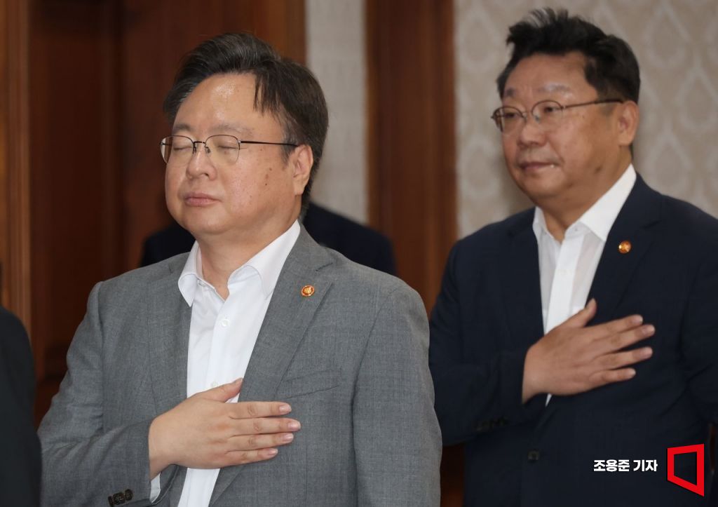 조규홍 보건복지부 장관(왼쪽)이 19일 서울 종로 정부서울청사에서 열린 국무회의에 참석, 국민의례를 하고 있다. 사진=조용준 기자 jun21@