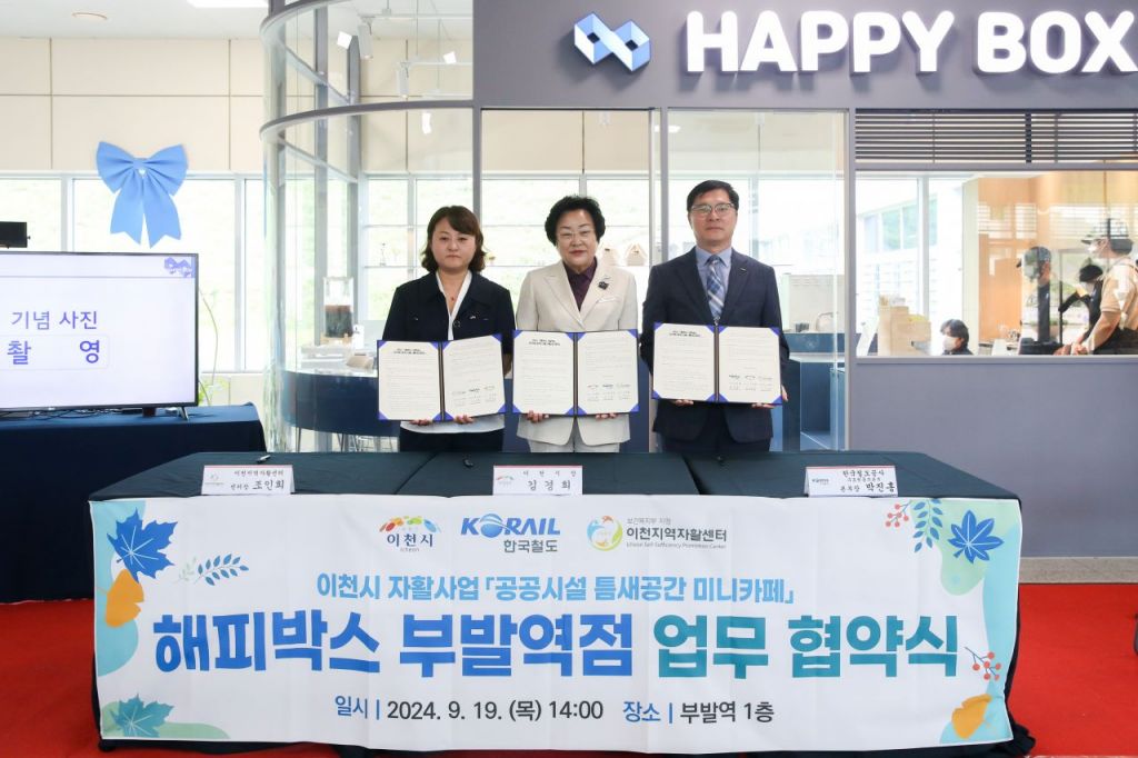 경기도 이천시는 19일 부발역 1층 맞이방에서 한국철도공사 수도권동부본부, 이천지역자활센터와 함께 공공시설 틈새 공간 미니카페인 '해피박스' 부발역점 업무 협약을 체결했다.