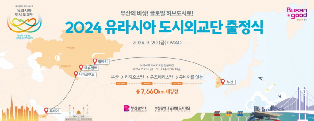 9월 20일부터 10월 2일까지 총 13일간 ▲알마티 ▲타슈켄트 ▲사마르칸트 ▲두바이, 3개국 4개 도시를 방문해 41개 행사를 통해 도시·분야별로 부산 브랜드 제고와 도시 간 교류 활성화를 위해 힘쓸 예정이다.
