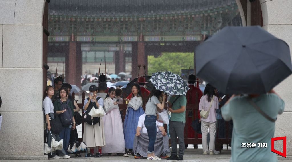 전국적으로 비가 내린 20일 서울 종로 경복궁을 찾은 관광객들이 비를 피해 이동하고 있다. 기상청은 21일까지 전국적으로 많은비가 내리고 나면 더위가 한풀 꺽일것으로 예보했다. 사진=조용준 기자 jun21@