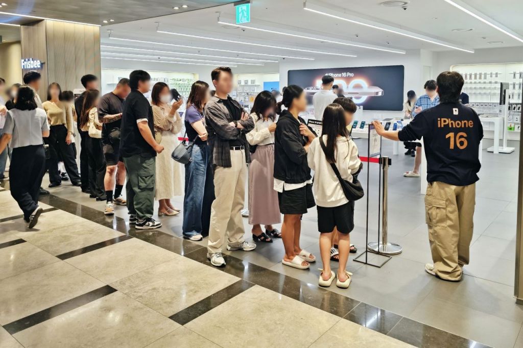 아이폰 16 시리즈를 구매하기 위해 대기 중인 고객들.