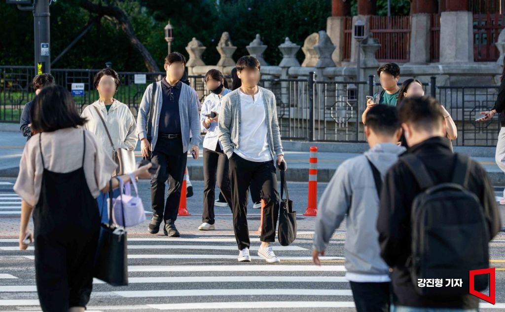 서울 아침 기온이 16도까지 떨어지며 완연한 가을 날씨가 이어지고 있는 23일 서울 종로구 세종로 네거리에서 직장인들이 긴소매와 겉옷 등을 입고 출근길에 오르고 있다.