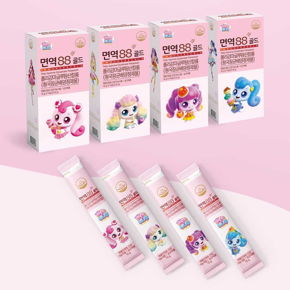이번 ‘티니핑’과 콜라보로 리뉴얼 출시된 면역88골드는 사과맛 액상 타입으로 아이들이 맛있게 간식처럼 섭취할 수 있게 한 것이 특징이다. 아이들이 좋아하는 인기 캐릭터를 더해 건강기능식품을 간식처럼 생각하고 맛과 건강을 모두 챙길 수 있도록 했다.