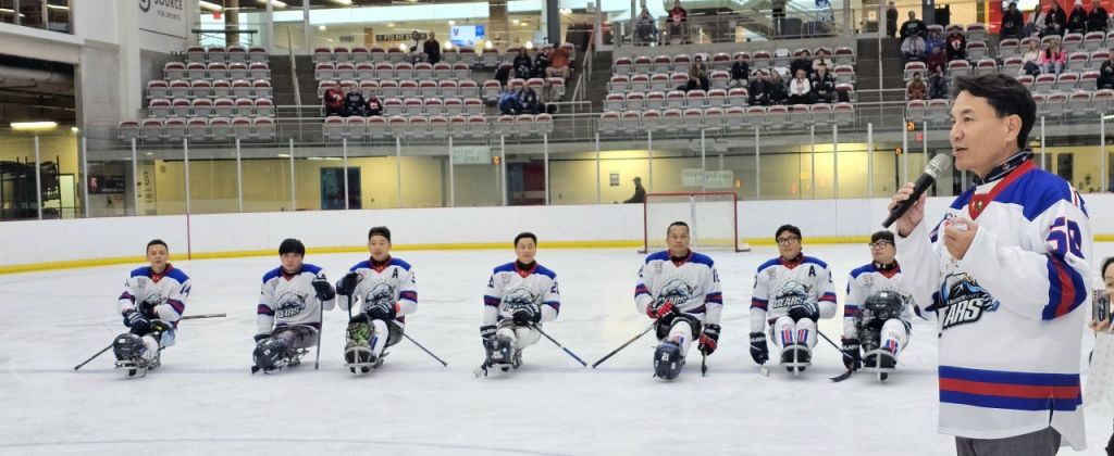 김진태 강원도지사가 22일(한국시간) 캐나다 알버타주를 공식 방문해 캘거리 올림픽파크에서 열린 강원도청 소속 장애인 아이스하키팀과 캘거리 클럽팀과의 친선경기에 앞서 인사말을 하고 있다. <사진제공=강원특별자치도청>