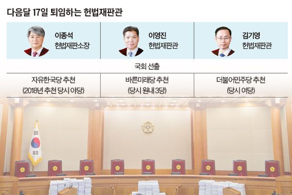 다음달 퇴임을 앞둔 이종석(63·사법연수원 15기) 헌법재판소장과 이영진(63·22기)·김기영(56·22기) 헌법재판관의 후임 재판관 인선을 두고 여야 간 합의가 난항을 겪고 있다. 헌재 업무에 공백이 생길 우려도 커지고 있다. 헌재소장 임기 문제도 해결되지 않은 채 방치되면서 법률로 임기를 명확히 정해야 한다는 목소리도 높다.