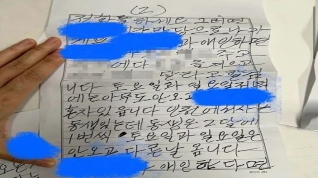 공개된 편지 사진을 보면 "전화하세요. 그러면 ○○이가 마당으로 나갈게요. 토요일과 일요일 저녁에는 아무도 안 오고 혼자 있다. 인천에서 사는 동생 있는데 동생은 두 달에 한 번씩 토요일과 일요일은 안 오고 다른 날 옵니다. ○○과 애인한다면"이라며 애인을 구한다는 내용과 함께 음담패설이 적혀있었다. A씨는 "할아버지를 신고하려고 하니까 팀장님들이 말렸다. 유명한 정신질환자라더라"라며 "뭐가 맞는 거냐. 신고할 수는 있을 것 같은데 별로 소용없을 것 같다"고 조언을 구했다.