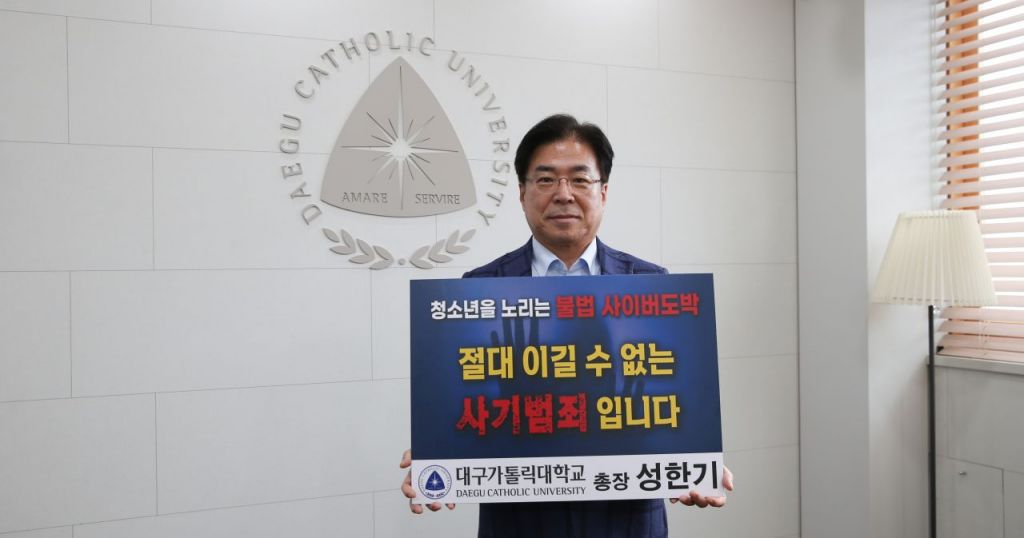 성한기 대구가톨릭대 총장은 지난 19일 ‘청소년을 노리는 불법 사이버도박, 절대 이길 수 없는 사기범죄입니다’는 문구가 적힌 손팻말을 들고 인증사진을 SNS에 올렸다.