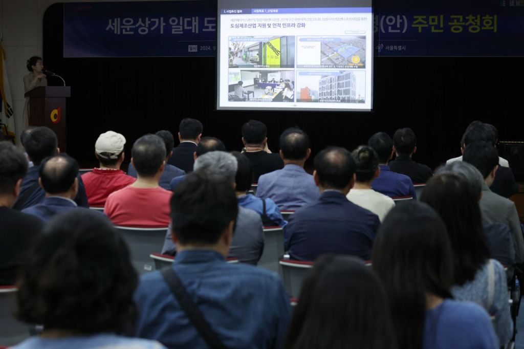 23일 오후 서울 중구 구민회관 소강당에서 '세운상가 일대 도시재생활성화계획 변경안'에 관한 공청회가 열리고 있다. [이미지출처=연합뉴스]