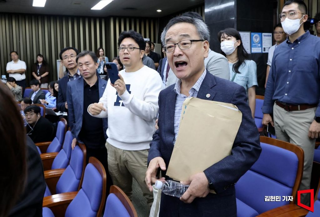 금투세 폐지를 주장하는 한국주식투자자연합회 회원들이 24일 국회에서 열린 금융투자소득세 관련 더불어민주당 정책의원총회 토론회 참석을 요구하며 항의하고 있다. 사진=김현민 기자 kimhyun81@