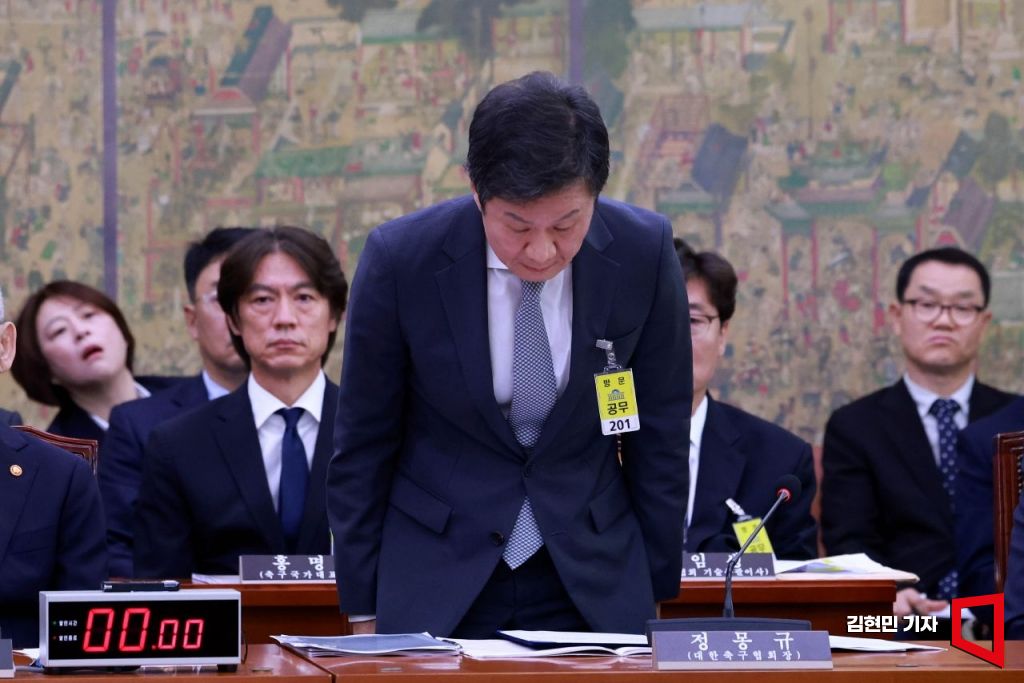정몽규 대한축구협회장이 24일 국회에서 열린 문화체육관광위원회의 대한축구협회 등에 대한 현안질의에 참석해 인사하고 있다. 사진=김현민 기자 kimhyun81@