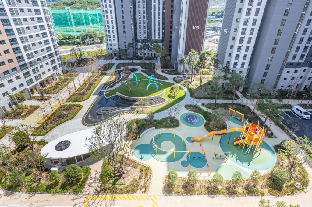 메인광장은 티하우스, 미술작품이 조화를 이루도록 했고 편안한 휴식 공간으로 조성됐다. 단지를 가로지르는 산책로는 소나무 아래 다양한 초화와 미스트폴, 미술작품을 배치해 청량감을 준다. 특색있는 놀이터 3개소와 연령별로 운동할 수 있는 스마트 운동기구, 피트니스코트도 설치돼 있다. 단지 외곽 산책로 입구에는 단지의 상징성을 더하는 사인월이 배치돼 있다. 나무수국, 청사초, 팜파스그라스, 핑크뮬리 등 식물원처럼 구현한 풀꽃길도 펼쳐진다.