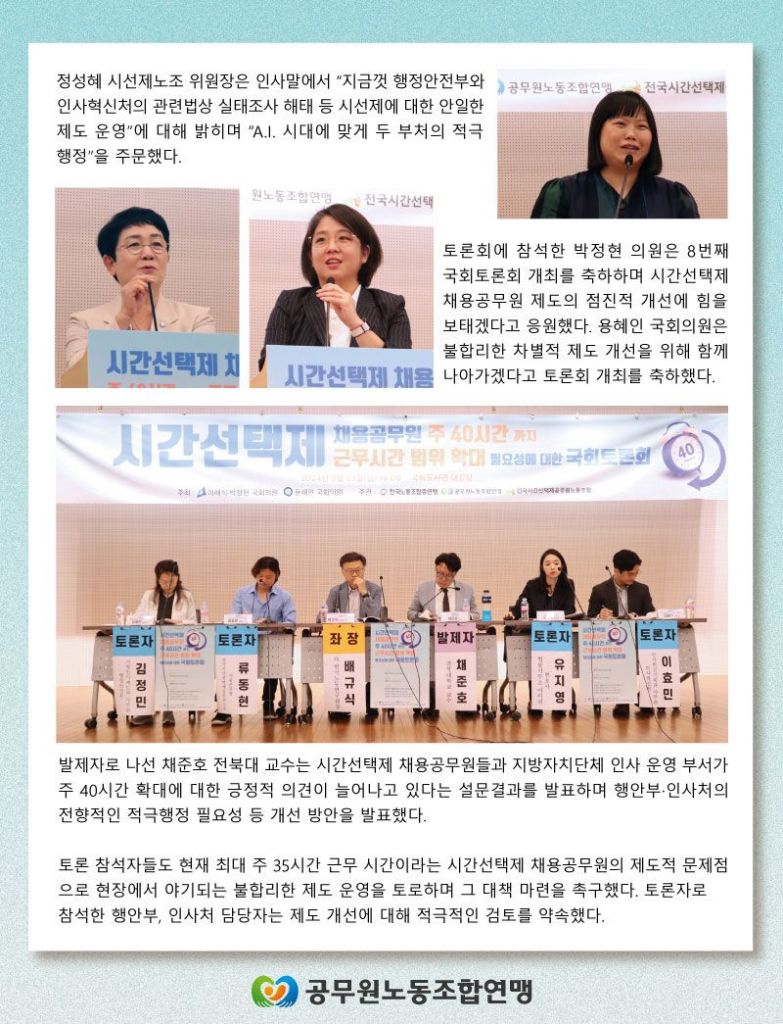 정성혜 시선제노조 위원장은 “현행 지방공무원 인사제도 운영지침 제80조제4항과 공무원 임용규칙 제93조제4항에서 각각 ‘행정안정부장관과 인사혁신처장은 시간선택제공무원 등을 대상으로 인사상 고충과 시간선택제근무 장애요인에 대하여 실태조사를 실시하고 조사결과에 따라 해당 자치단체에 개선권고를 할 수 있다’고 규정하고 있으나, ‘시간선택제 채용공무원 제도의 현황과 문제점에 대한 정부 연구용역이 진행된 적이 없어 6월 25일 발제를 맡아주신 채준호 전북대 교수님과 ’시간선택제 채용공무원 임용 10년에 따른 실태조사 및 개선방향 등에 관한 연구용역‘을 체결하고 그 결과를 국회토론회를 통해 발표하게 됐다.